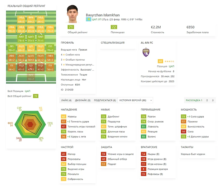 Рейтинг Исламхана является самым высоким среди казахстанцев, по крайней мере, был до определенного момента. Я считаю, что EA Games вполне угадали с характеристиками игрока и метко попали в каждый из пунктов. Могут быть вопросы только к точности удара, а выносливость – бич казахстанского футбола.