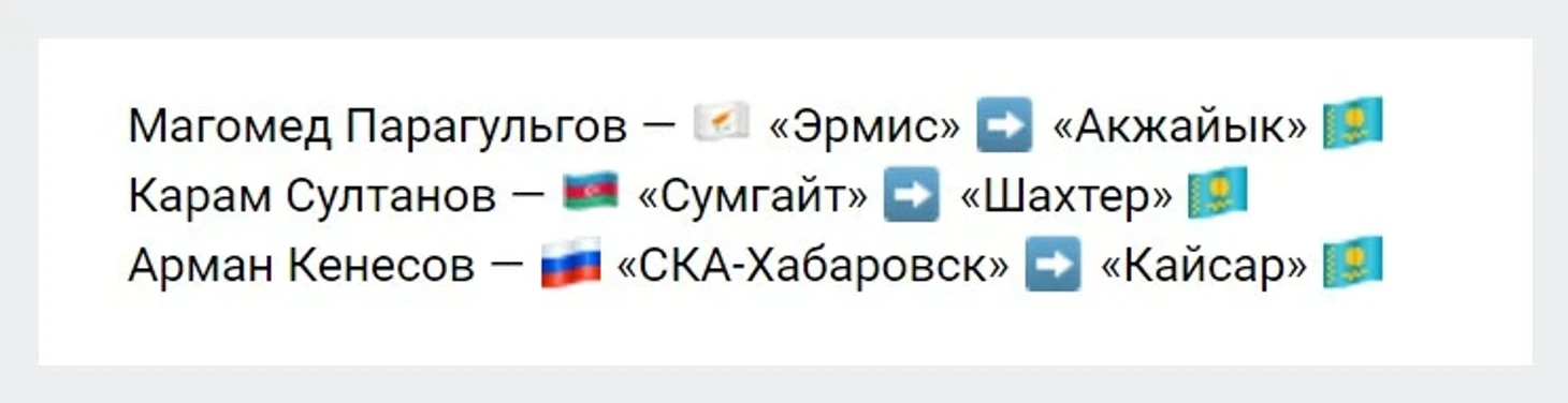 С клубами КПЛ контракты подписали Магомед Парагульгов, Карам Султанов и Арман Кенесов, все футболисты в 2020 году выступали в составе зарубежных команд.