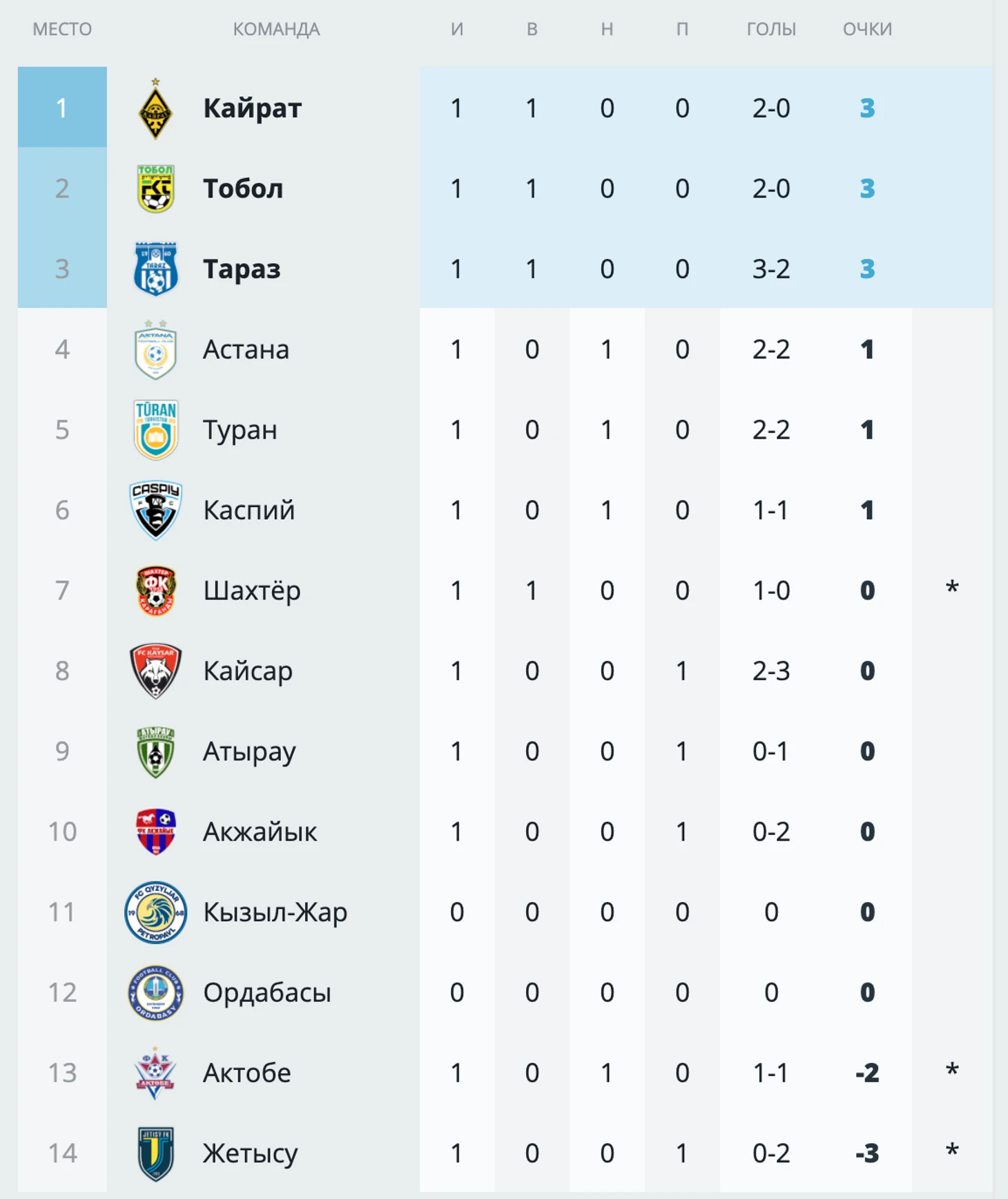 Старт чемпионата начался с матча действующего чемпиона – «Кайрат» дома обыграл «Жетысу», даже несмотря на удаление Дениса Полякова.