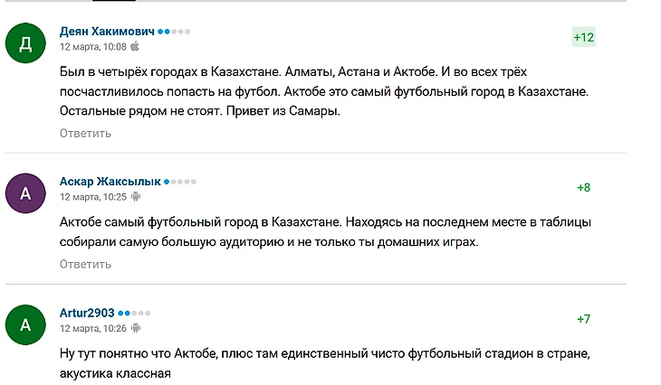 Что у нас есть? Какая ситуация по сообществу? Есть разбросанные по спортсу болельщики Барсы, Челси, Юве и др, но минимум реакции на локальные новости. Мы, казахи, с удовольствием подчеркиваем свою идентичность когда находимся в чужой среде, среди иностранцев. Например, на обсуждении КХЛ, инсте Зенита или ЦСКА. Но когда остаемся сами с собой, то, особенно, без ажиотажа. Турсынбек Кабатов сочинил бы шутку. Вот один из подтверждающих примеров - наиболее заплюсованные комментарии из недавнего поста о самом футбольном городе.