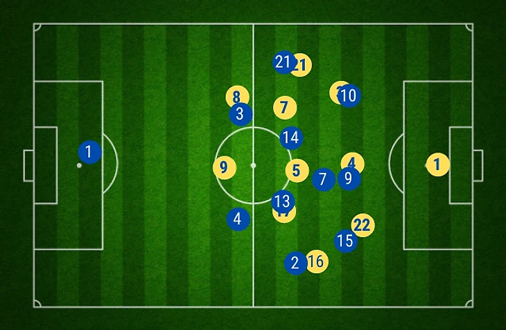 Главный тренер Андрей Шевченко логично выбрал оборонительную стратегию против «трехцветных», формация на матч «5-3-2» (в скобках замененные игроки):