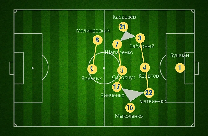Шевченко провел интересные замены: нападающего Яремчука заменил Мораес, Зубков вышел в нападение на место Малиновского, спустившегося на позицию замененного хавбека Шапаренко, а полузащитника Сидорчука по позиции заменил Коваленко.
