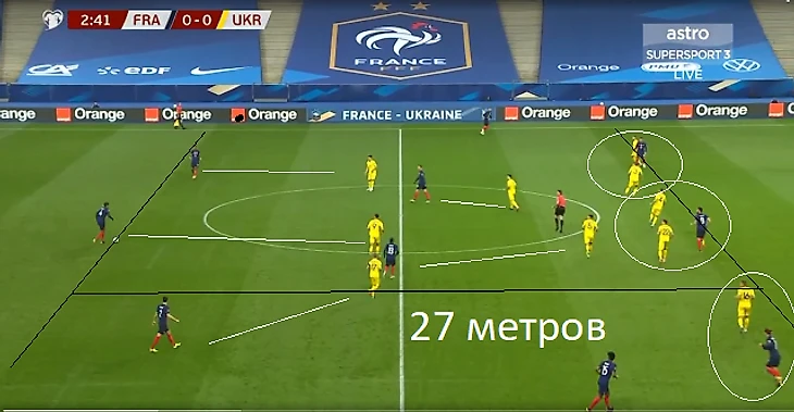 «Желто-синие» навязали борьбу и смогли в некоторых компонентах сыграть лучше соперника: Прессинг и отборы мяча. Прессинг приведший к отборам: 8 у французов, 18 у украинцев. Игроки левого фланга Зинченко (2), Мыколенко (4), Матвиенко (3) втроем сделали больше отборов, чем вся команда французов. Одинаковая эффективность успешных отборов 55%, при этом украинские игроки предприняли 34 отбора, из которых игроки правого фланга, просто замучив Мбаппе частым прессингом, произвели 17 попыток отбора. Нна правом фланге – 13 отборов.