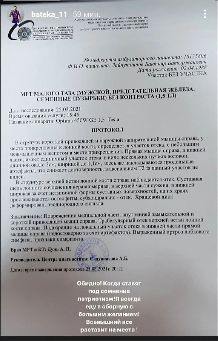 К своему сообщению приложил свежее медзаключение. МРТ показало, что у футболиста действительно есть проблемы.