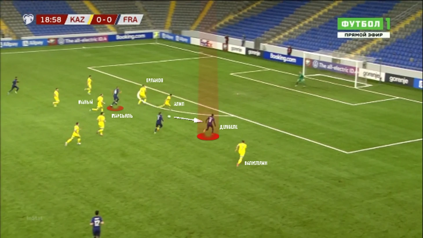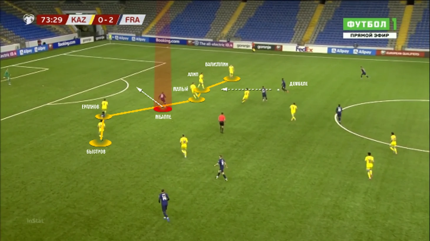 Защитник сборной Франции легко справились с попыткой прессинга игроков Казахстана, далее транзитом через Ндомбеле мяч оказался у Усмана Дембеле, который увидел рывок Мбаппе в зону за спины защитников сборной.