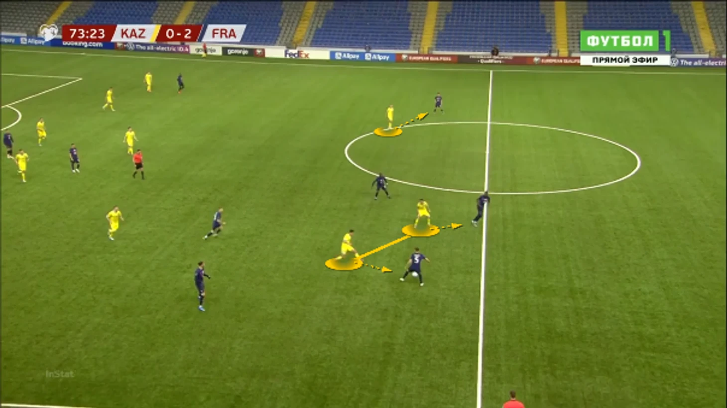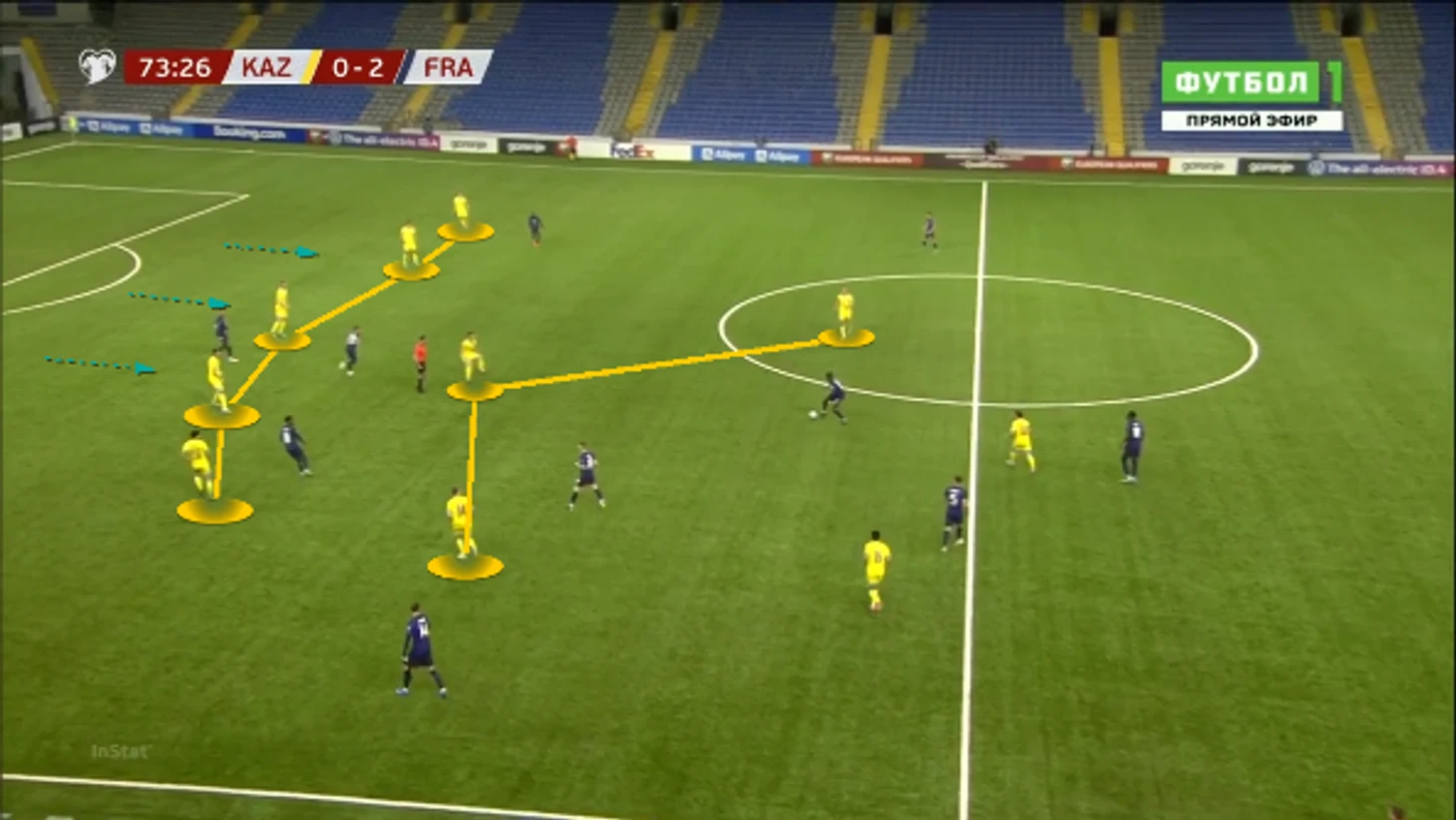 На 74-й минуте задумка Франции дала свои плоды. Атакующие игроки (Тунгышбаев и Нургалиев) сборной Казахстана пошли в неорганизованный прессинг и оказались в окружении пяти французов. Защита и полузащита Казахстан была не готова к этому и стала вынужденно поджимать атакующую линию.