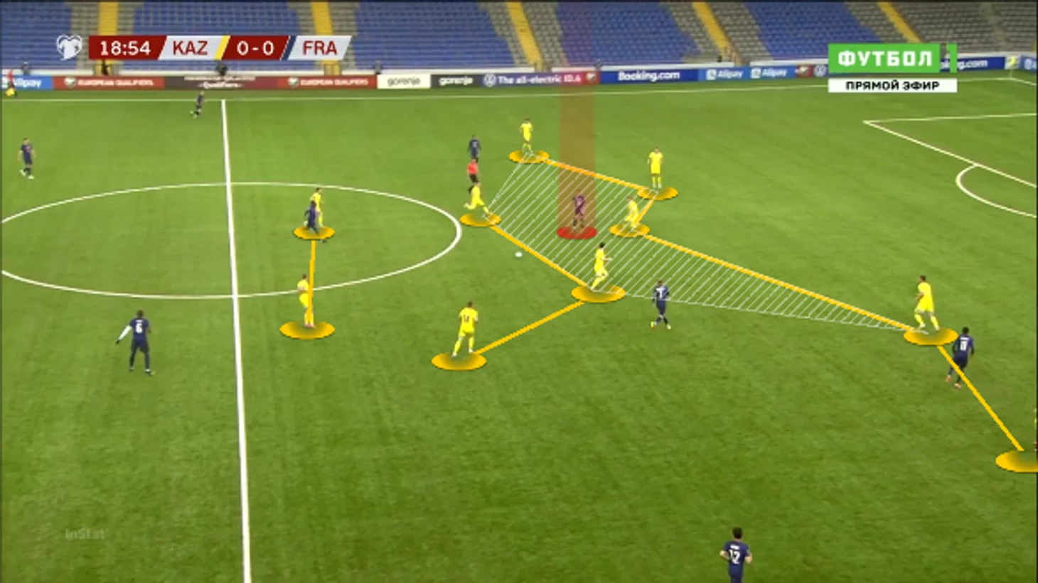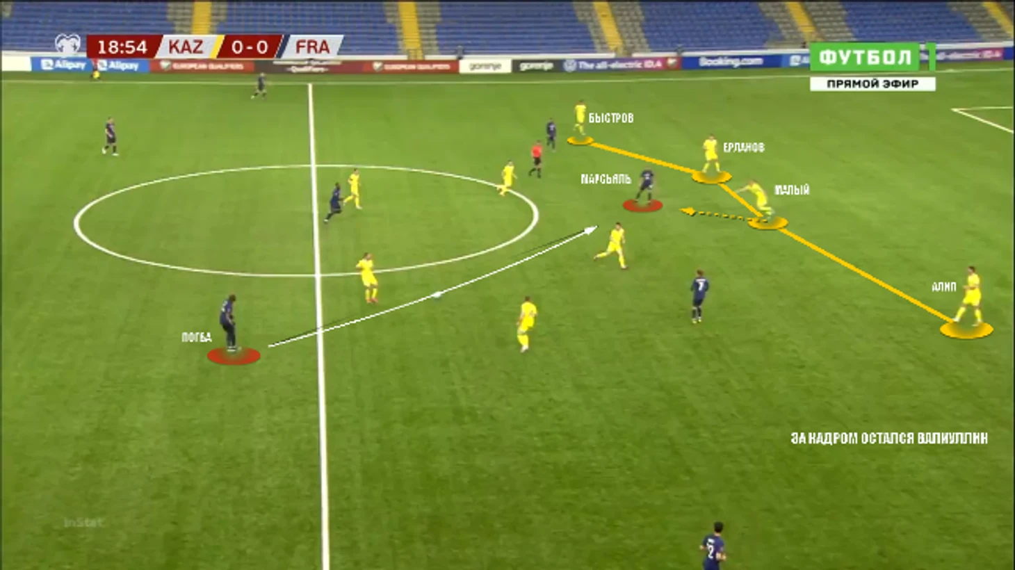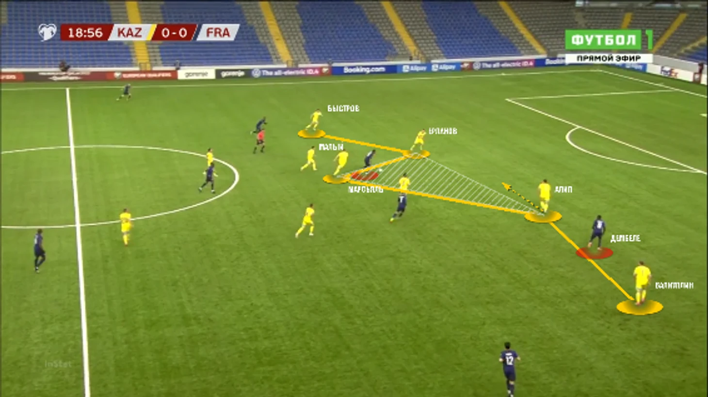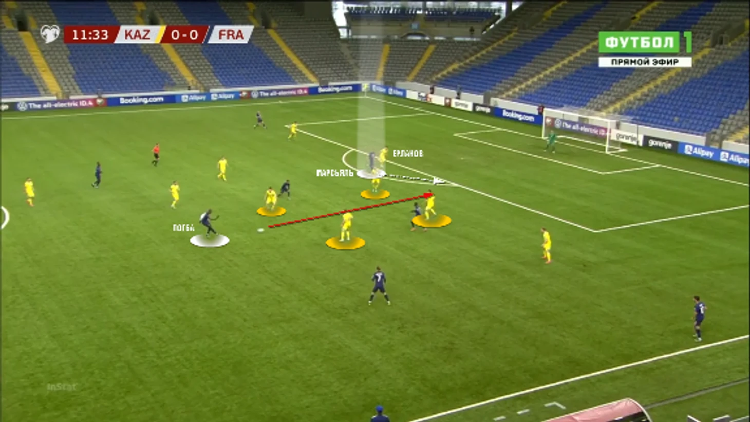 Погба проникающим пасом отрезает всю полузащиту сборной Казахстана. Марсьяль отскакивает от опекуна для получения мяча. Самый центральный из центральных защитников Сергей Малый предсказуемо выдвигается за нападающим Франции с целью не дать ему принять мяч и развернуться лицом к воротам, но шикарное обманное движение Антони решает эпизод в пользу гостей. За кадром остался левый латераль сборной Казахстана Руслан Валиуллин — он вернулся на исходную позицию после рейда в атаку и задержался в полупозиции при голевой атаке французов.