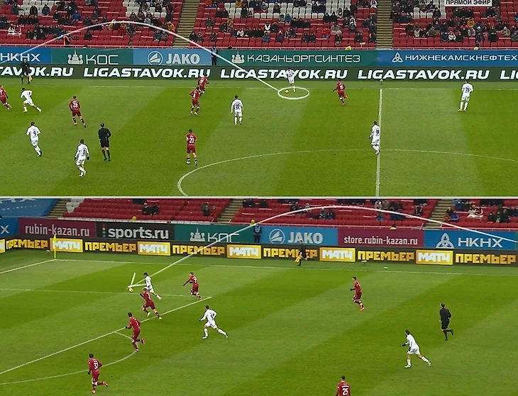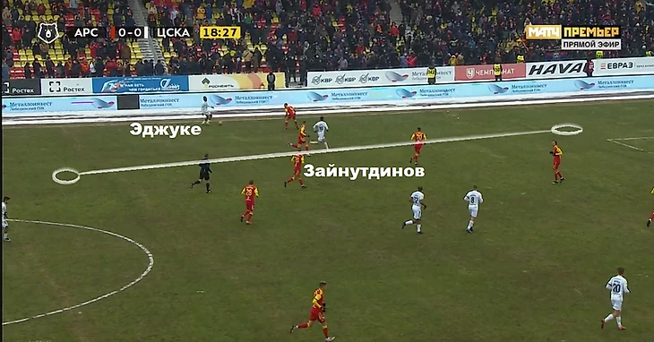 Помимо объема работы Зайнутдинов дает и умное движение с позиции фуллбека. Эджуке чаще прилипает к бровке и вытягивает крайнего защитника соперника на себя. Зайнутдинов здорово этим пользуется, вовремя стартуя в такие зоны.