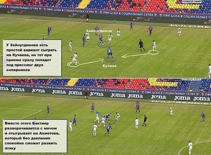 При этом Баха часто развивает атаки с позиции опорника. А в матче с «Зенитом» Бактиер и вовсе ситуативно исполнял роль защитника в тройке.