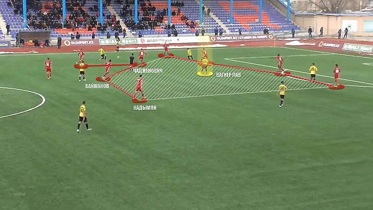 Скрин третьей голевой атаки «Кайрата»: Лав здорово открылся между линиями и разогнал атаку через центр. Курманбекулы не контролировал передачу на бразильца, хотя решение Косовича (на картинке с мячом) было очевидным – пас на Вагнера.