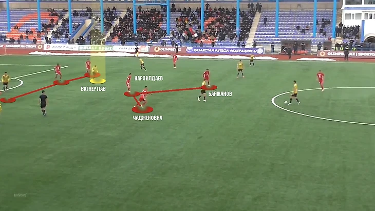В первом туре (игра с «Таразом», счет 2:3) Абильдаев в стартовом составе выпустил тройку полузащитников: Чадженович-Нарзилдаев-Байжанов. Роль нижнего опорного ожидаемо выполнял Чадженович, а Нарзилдаев с Байжановым должны были отвечать за созидание и креатив в центре. Сказать, что Чадженович справился с задачей разрушения, тяжело, так как один гол – победный мяч Бауыржана Байтаны – кызылординцы пропустили при полном бездействии полузащитников «волков».