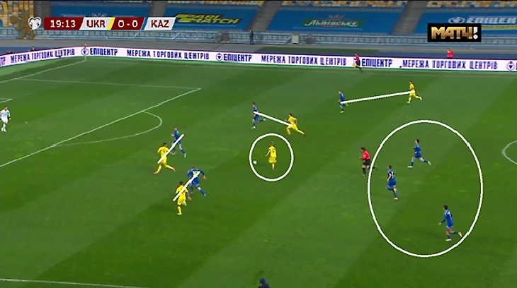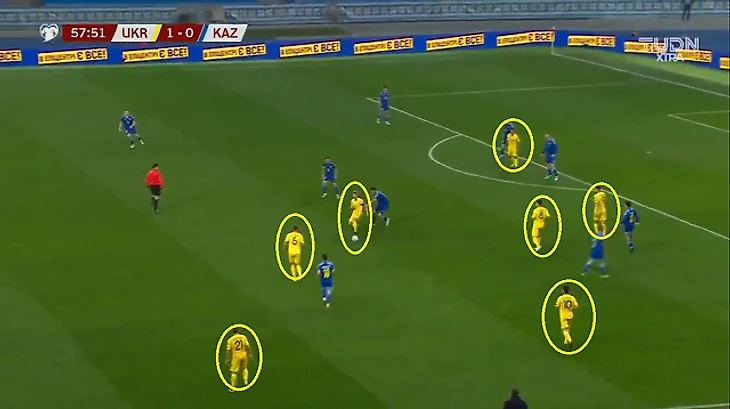 Если в матче с французами 55% активности происходило на правом фланге, откуда и был организован гол, то в следующем матче финны, понимая сильную сторону соперника, создали противодействие на правом фланге сборной Украины, те в ответ 46% времени провели в атаках на левом фланге, хотя гол был создан так же с правого фланга. С Казахстаном, играя с позиции доминирования, большинство атак проходило через центр и левый фланг.