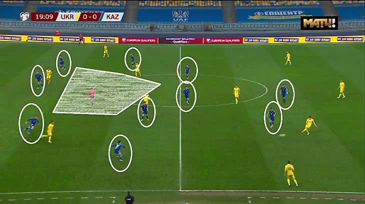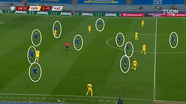 Фактически казахстанцы играли в первом тайме в «4-4-2», чтобы усилить противодействие в средней линии, за счет смещения флангового защитника.