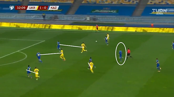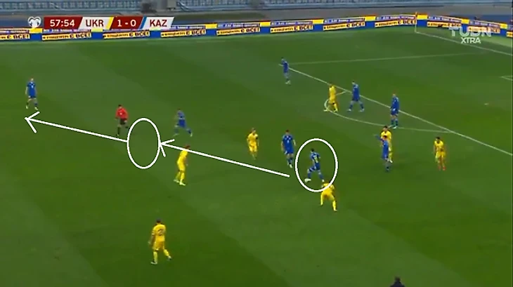 Байсуфинов, читал он или нет, подготовил команду к «вязкой игре», неудобной для украинцев, активной борьбой во второй трети поля. Ставит своеобразный стиль от катеначчо, который в шутку называю «Казахстеначчо», с активной игрой в опорной зоне центрального защитника – Сергея Малого, который подключался к разрушению атак украинцев, перехватам в обеих играх, быстрым флангам, среднему блоку, управлению пространством через «ромб», коротким быстрым передачам при выходе из обороны.