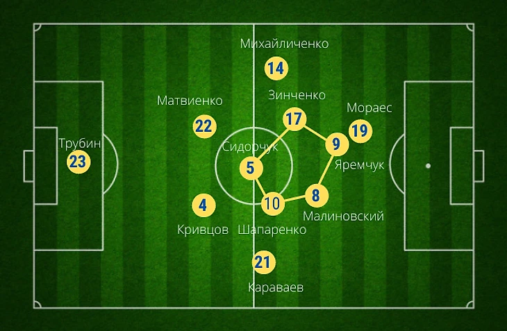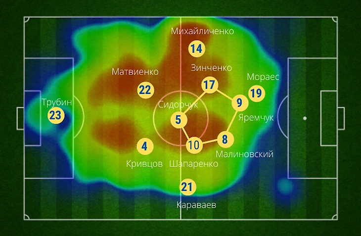 Это наблюдение подтверждается наложением тепловой карты игры «желто-синих» на позиции игроков в матче. Основная активность шла от 6-ти игроков: Сидорчук, Шапаренко, Малиновский, Зинченко, Яремчук и слева Михайличенко.