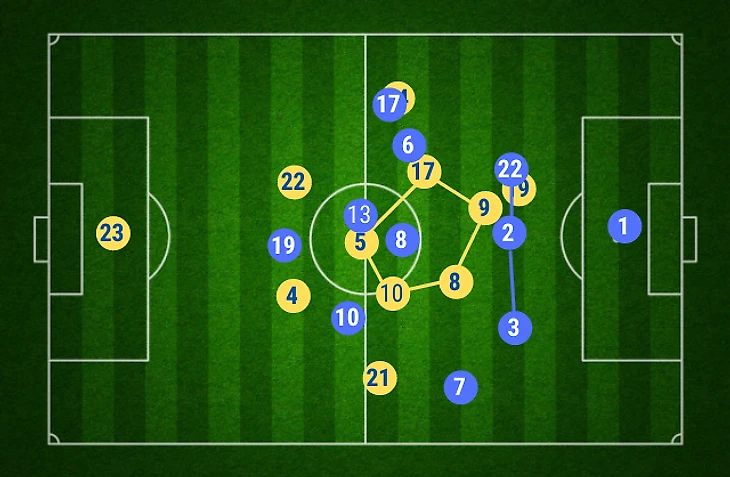Из схемы выше видно, что игроки в желтой форме доминировали, полностью навязывая свою игру гостям, борьба происходила на половине поля гостевой команды.