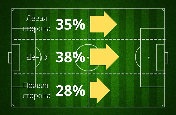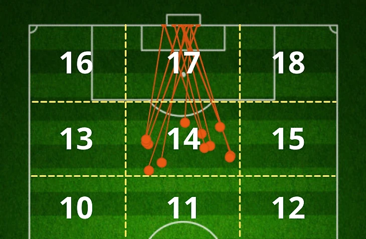 «14 зона» – это зона перед воротами, в чем ее важность? Аналитика показала, что игрок с мячом в «14 зоне» имеет наибольший и наилучший выбор дальнейшего решения, будь то отдать передачу в штрафную или пробить из довольно опасной позиции. Факт, что успешные команды умеют доставлять мяч в «зону 14» и грамотно её использовать.