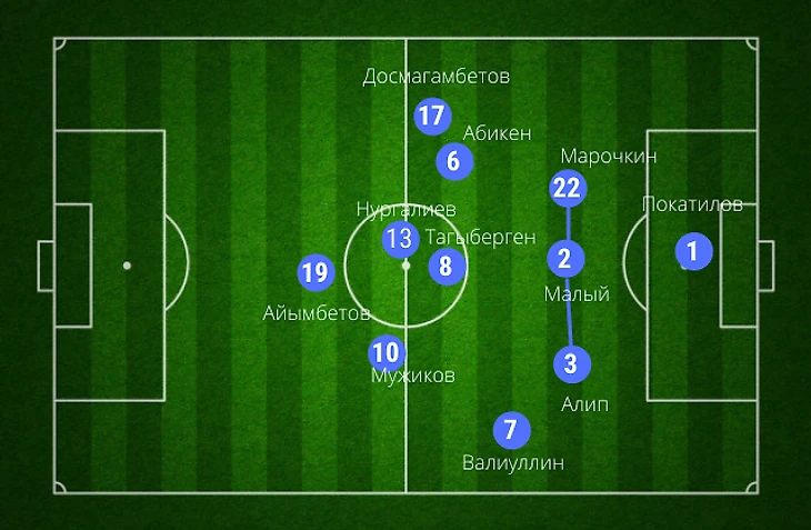Талгат Маруанович обновил состав почти на половину, включив Покатилова, Марочкина, Досмагамбетова, Абикена и Айымбетова, выстроив на старте в «5-3-2».