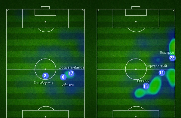 Алип, которого подстраховал Оразов, выдвинулся в отбор на Зинченко, далее Мужиков перехватил пас на Сидорчука и начал веерную голевую контратаку: Мужиков – Нургалиев – Вороговский – Нургалиев – Мужиков.