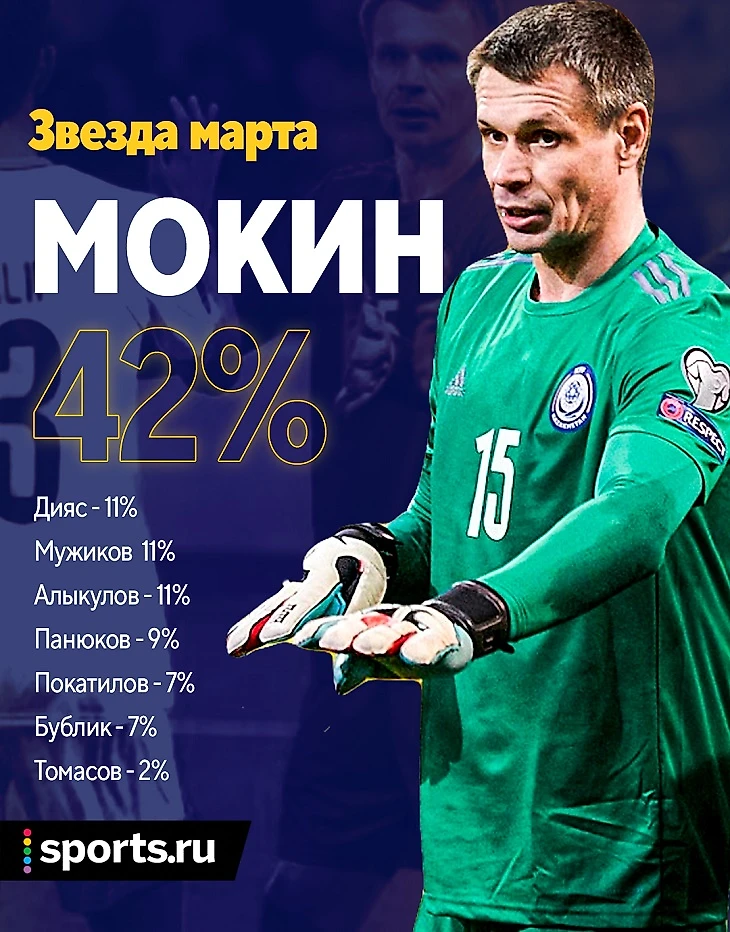 В 2021-м Sports.ru Казахстан ежемесячно выбирает самого яркого спортсмена. В опросе по итогам марта была большая конкуренция – сразу 8 номинантов. Но уверенную победу одержал голкипер «Тобола» и сборной Казахстана Александр Мокин. Вы отдали за него 42% голосов.