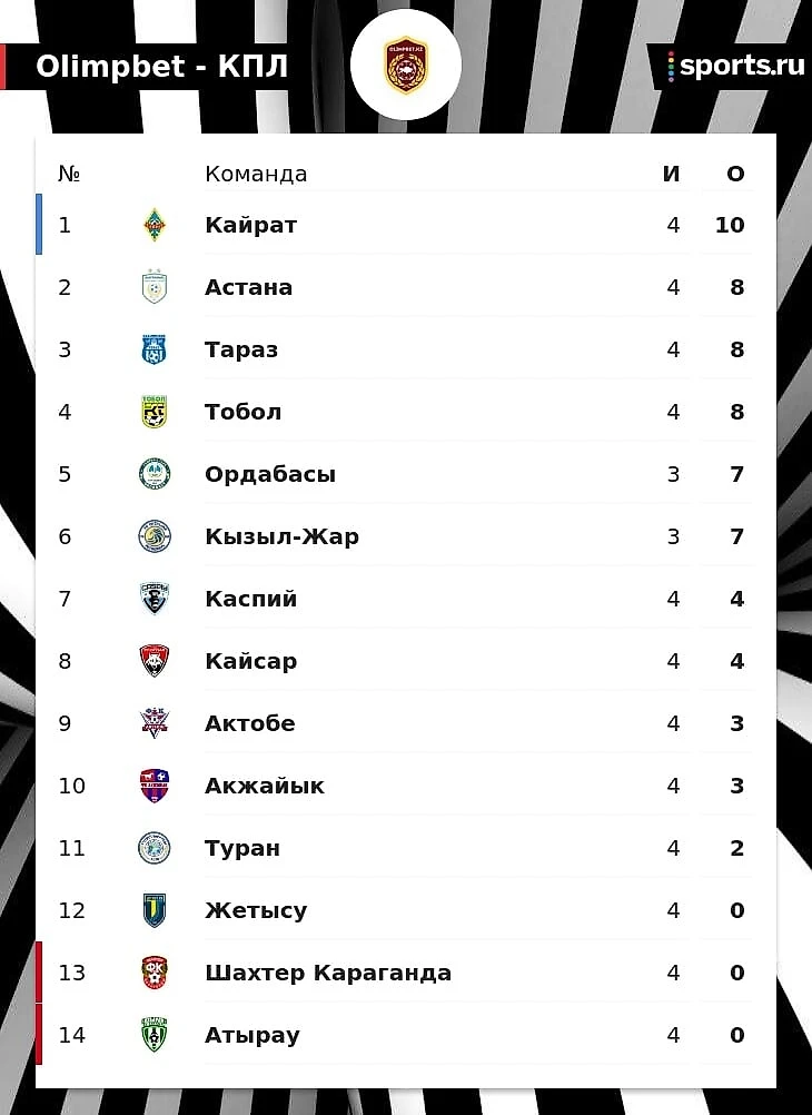 «Кайрат» по-прежнему первый, «Тараз» вошел в тройку, а «Тобол» замыкает четверку. Таблица КПЛ после 4-го тура