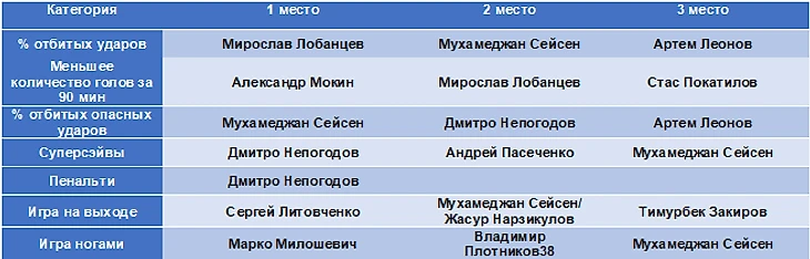 Процент отбитых опасных ударов (Супресэйвы/(Пропущенные голы+Суперсэйвы): 1. Мухамеджан Сейсен; 2. Дмитро Непогодов; 3. Артем Леонов