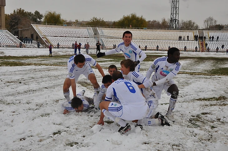 После перерыва команды меняются воротами, я тоже пошел на другую сторону, как тут меня журналистка из Тараза за куртку схватила: «Не надо, пожалуйста, оставайтесь здесь с нами». А я-то знаю, что у нас еще два гола осталось. Пошел на другую сторону, снял еще два гола и сделал фотосессию игроков «Ордабасы» в сугробах. Они так радовались выходу в финал.