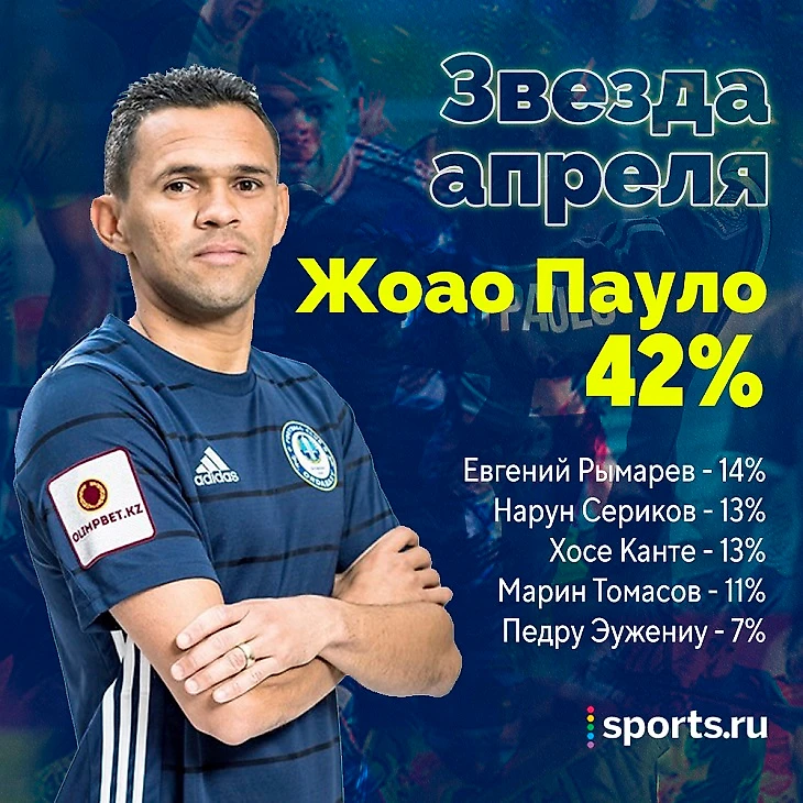 В 2021-м Sports.ru Казахстан ежемесячно выбирает самого яркого спортсмена. В опросе по итогам апреля вы отдали больше всего голосов за лидера бомбардирской гонки КПЛ Жоао Пауло.