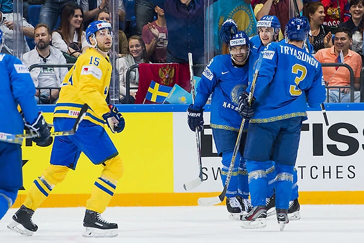 Сначала была перестрелка с хозяевами турнира – сборной России. Казахстан трижды отыгрывался и единожды выходил вперед. Сперва счет открыл Евгений Дадонов, после чего Бойд и Старченко превратили 0:1 в 2:1. Россия ответила голами Любимова и Мозякина – счет 2:3 установился уже на 12-й минуте. Под занавес первого периода Рымарев сравнял.
