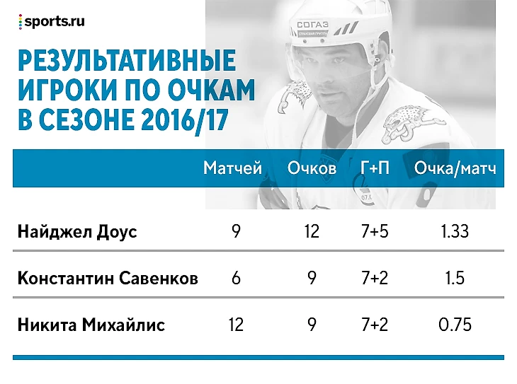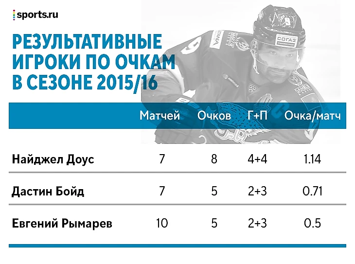 Но есть и минусы: после этой троицы идет большая пропасть по результативности. Четвертый игрок в списке Шин набрал 3 очка (0,5 за игру). Это говорит о том, что помощь еще одного завершающего в атаке нам бы не помешала. Доус — самый очевидный вариант. Но помог бы он в случае выхода в плей-офф? Как известно, у Найджела часто возникают проблемы с реализацией на этапах выбывания в КХЛ.
