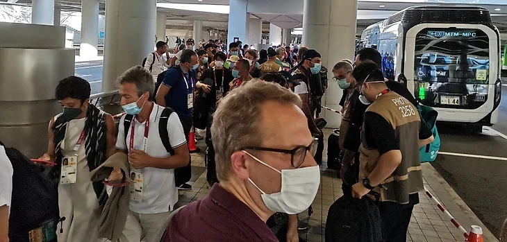 11:37. Наш токийский десант уже подъезжает к Олимпийскому стадиону. Вот так выглядят японские шаттлы, которые развозят всех по объектам, а слева от него – зона, где невозможно соблюдать социальную дистанцию. В самих автобусах, конечно же, тоже очень плотно: желающих ехать много. А при входе на арену очереди: и стандартный досмотр, и антиковидные проверки.