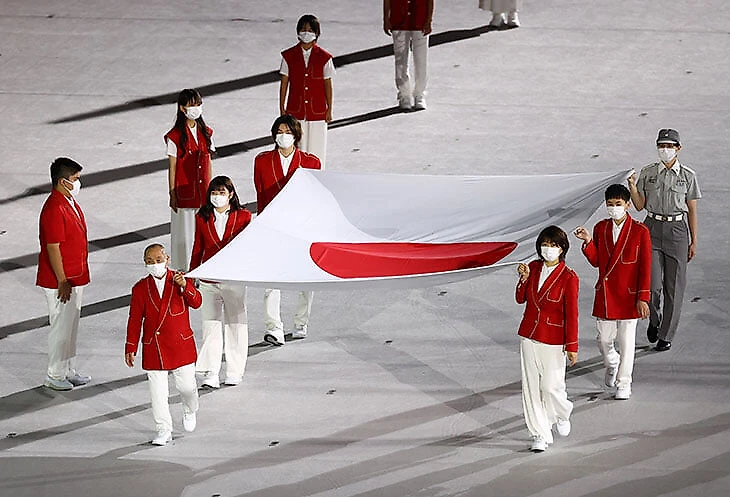 14:24. Японский флаг на арену вынесли четверо спортсменов, человек с инвалидностью и работник сферы здравоохранения (в сером справа) – это благодарность врачам, которые помогают справляться с коронавирусом.
