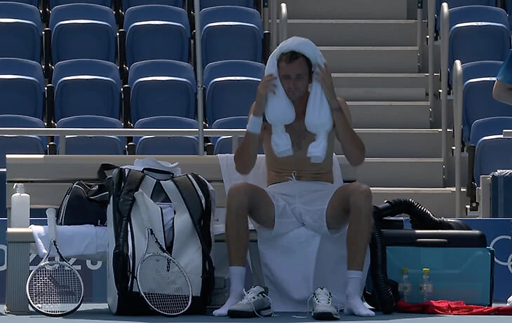 7:15. Медведев сразу сделал брейк, выиграл первый сет 6:4. А главная задача в перерыве – охладиться. Да, футболка тут лишняя.