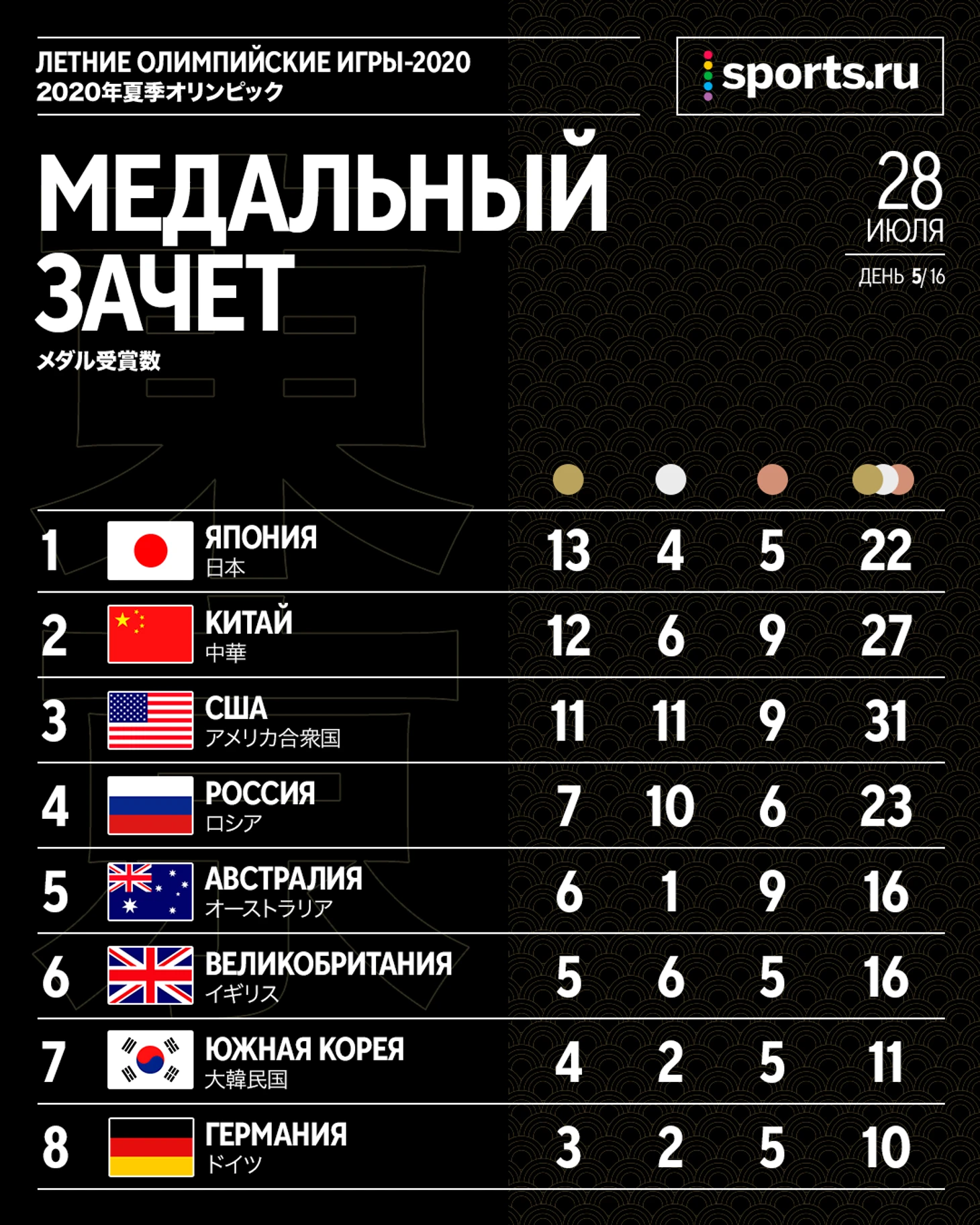 • Япония сохраняет лидерство – причем борьба очень упорная. За день Китай взял три золота, японцы – столько же.