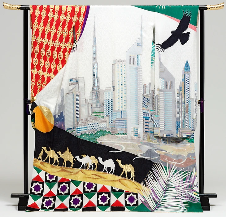 Для Казахстана японцы сделали кимоно, на котором изображены лошади в степи, которые символизируют храбрость Казахстана, солнце и луга – блага природы, а ветряные мельницы – прошедшее в столице Экспо-2017. А пояс кимоно сшит в цветах флага Казахстана, где изображены венки из тюльпанов. Его автором является Кумико Мачида, а пояс создал Каори Синкай.