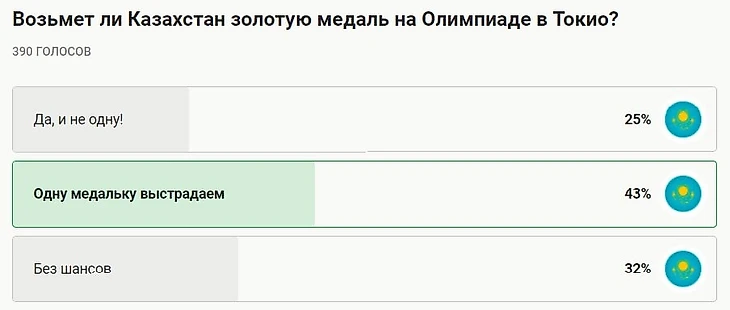 25% из вас были настроены наиболее оптимистично и верили, что в активе нашей сборной будет не один золотой кругляш, а два или больше. Большинство (43%) считало, что сил хватит лишь на одну медаль высшей пробы. И 32% ответивших были убеждены, что никто из казахстанских спортсменов так и не поднимется на самый верх токийского пьедестала. Правда осталась за последней группой.