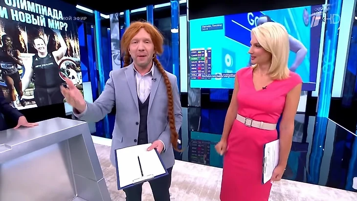 Лосева задалась вопросом, как называть тяжелоатлетку Лорел Хаббард – он, она, оно, но в итоге в студии остановились на слове «человек». А соведущий Анатолий Кузичев вышел в эфир в парике с косичками.