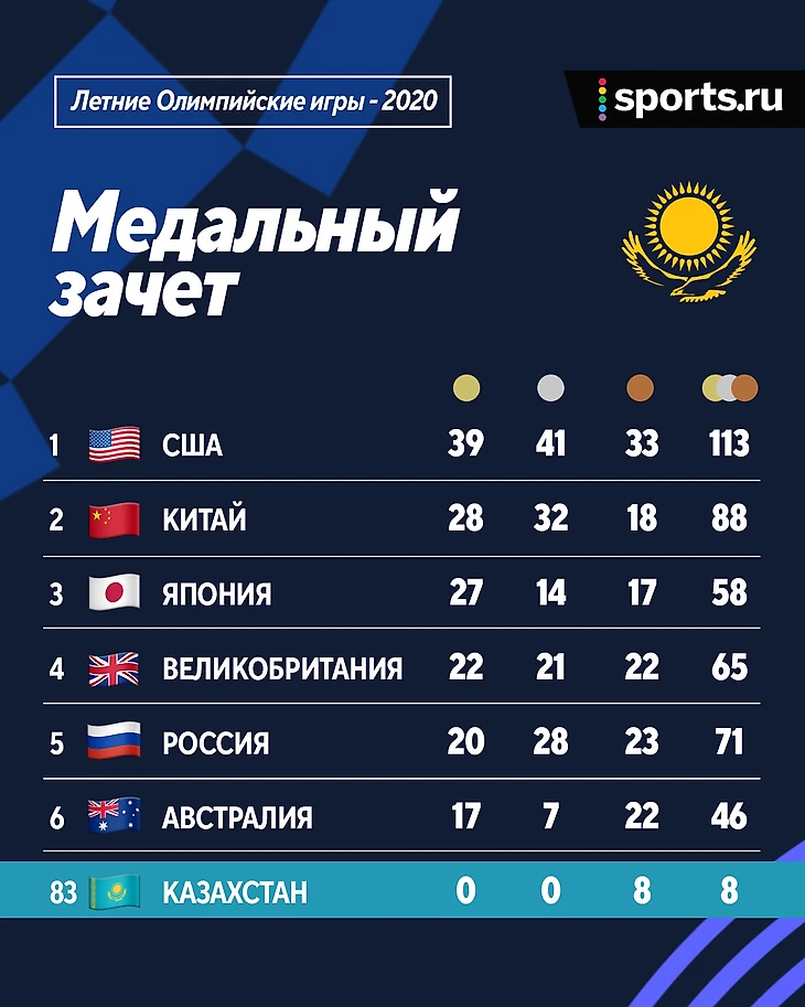 В медальном зачете наша сборная заняла 83 место. Это самый худший результат за все время выступлений на летних Играх.