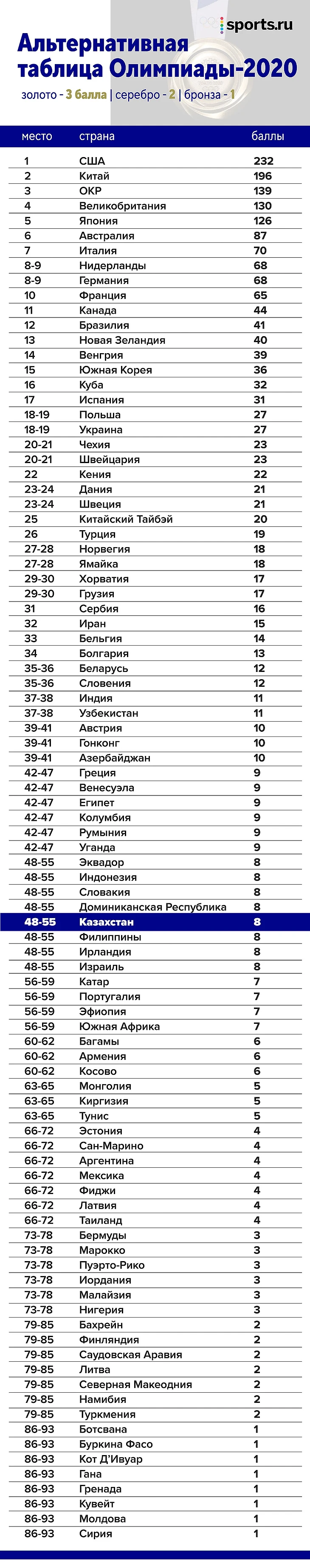 Альтернативная таблица Олимпиады. Даже так Казахстан лишь в середине рейтинга