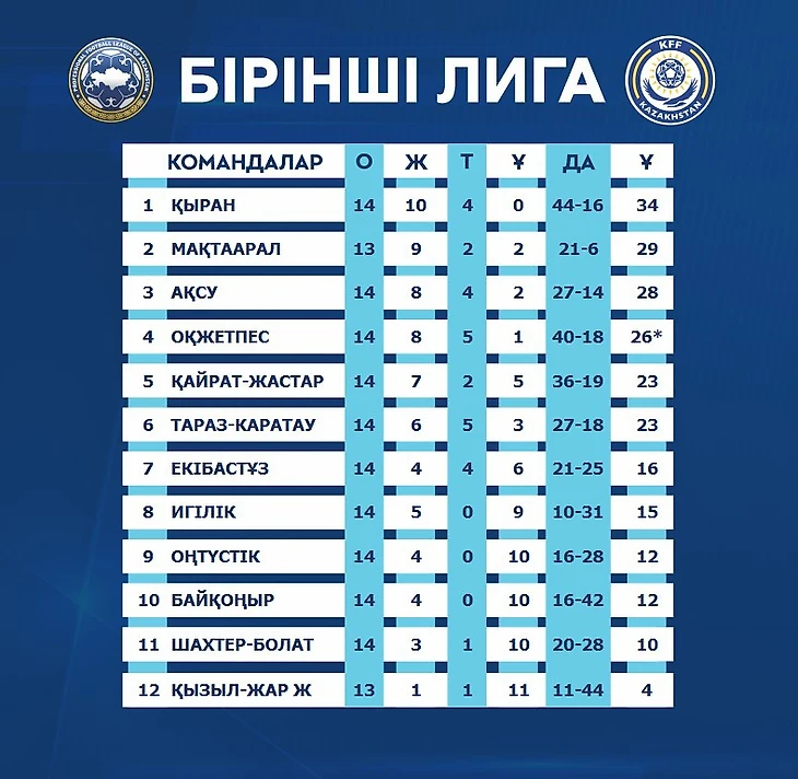 Футболдан Қазақстан Бірінші Лигасының 14 тур қорытындысы бойынша турнир кестесі жарияланды. Түркістандық «Қыран» 34 ұпаймен жеке дара көш бастап тұр, оның артынан оңтүстіктің тағы бір клубы «Мақтаарал» да қуып келеді. Қазақстан Чемпионатының 2022-жылғы маусымына «Қыран» алғашқылардың бірі болып жолдама алуға басты үміткер.