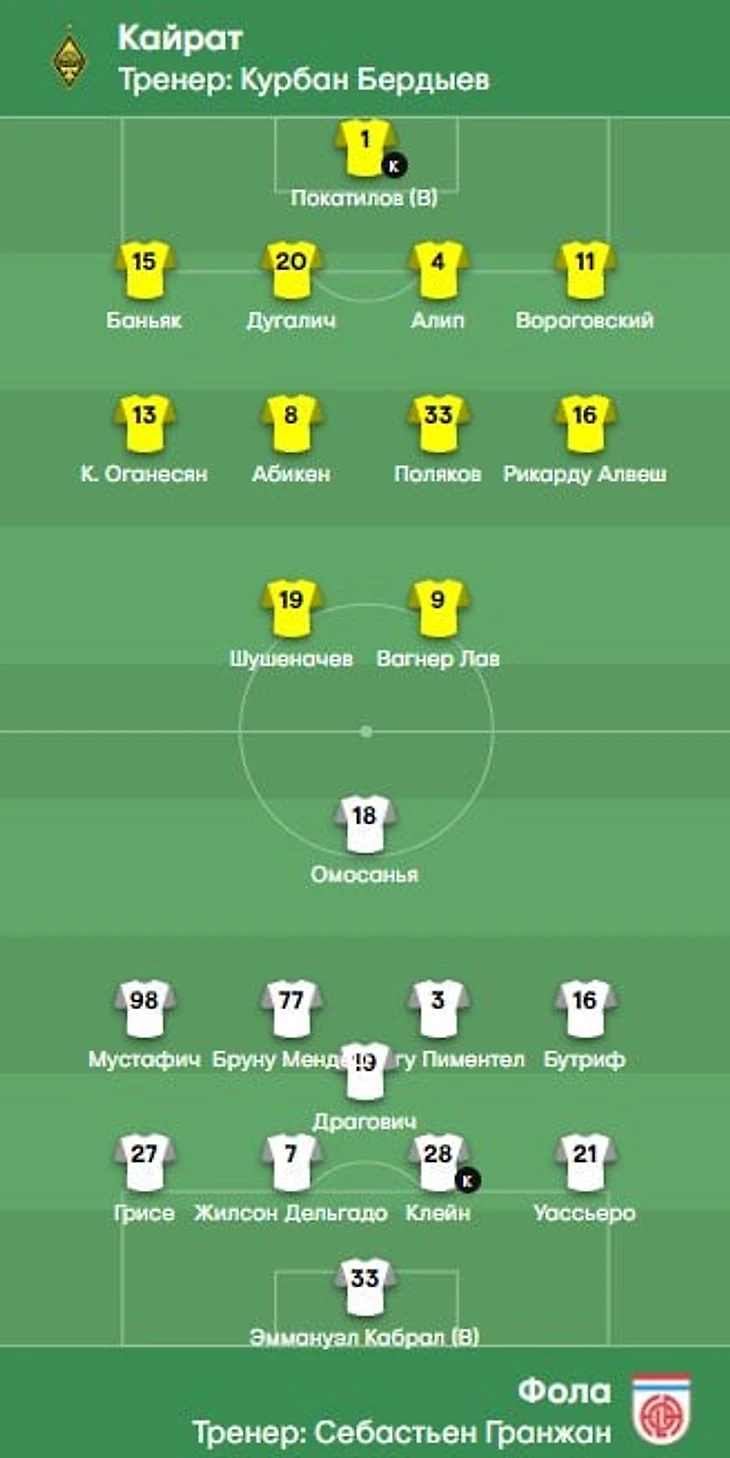 А вот и первые замены «Кайрата». Вместо Шушеначева выходит Алыкулов, Косович заменил Абикена.