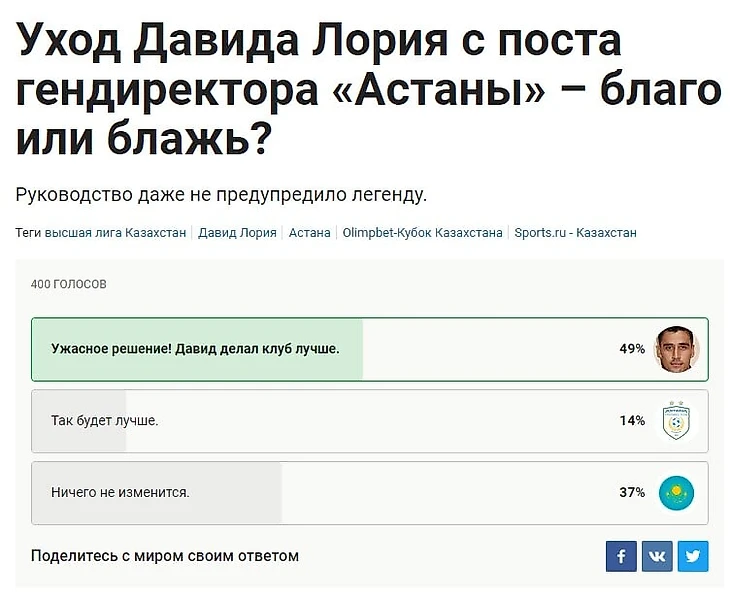 Опросы на Sports.ru: вы осудили увольнение Лория из «Астаны» (многие сочли, что ничего не изменится) и поприветствовали Бердыева в «Кайрате»