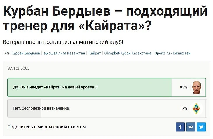 Что касается назначения Курбана Бердыева главным тренером «Кайрата», то подавляющее большинство ответивших (83% от 589 пользователей) с радостью встретило возвращение легенды в команду.