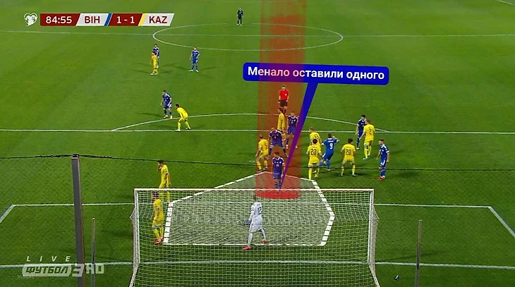 На втором голе стоит заострить внимание. Как так получилось, что у организованной сборной Казахстана в центре штрафной площади оказался игрок без опеки?