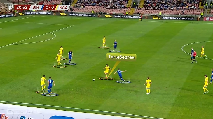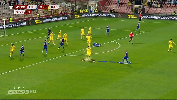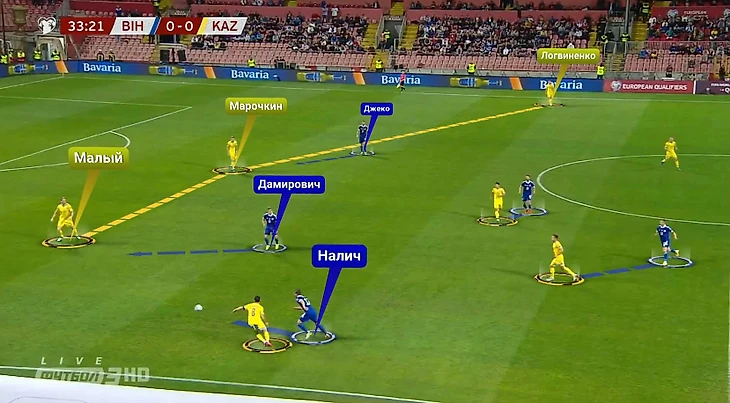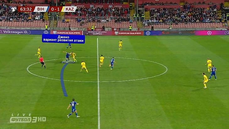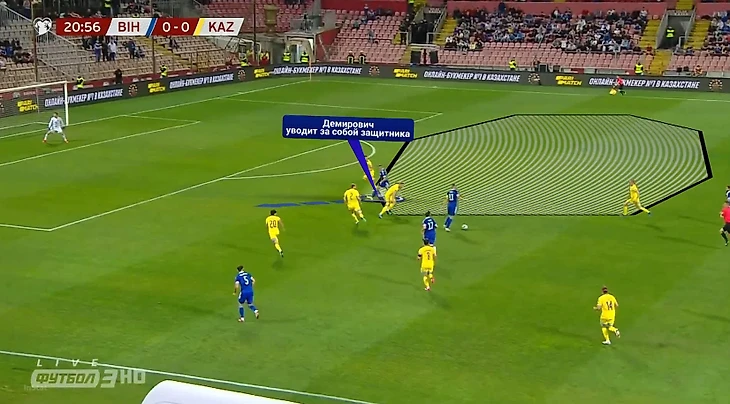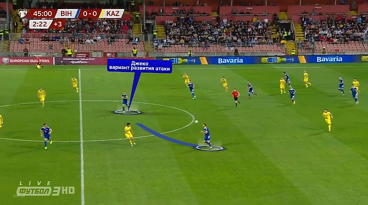 Пример атаки сборной Боснии и Герцеговины, когда левый фланг Казахстана был максимально оголен. Вороговский задержался впереди (за кадром), а Джеко, оказавшись с мячом, атакует эту зону. Через мгновение проникающая передача от Эдина будет адресована на Пьянича, но в ситуации 1 на 1 Шацкий играет уверенно. Обратите внимание, насколько грамотно в этой атаке действует Демирович — своим открыванием нападающий немецкого «Фрайбурга» уводит за собой Юрия Логвиненко.