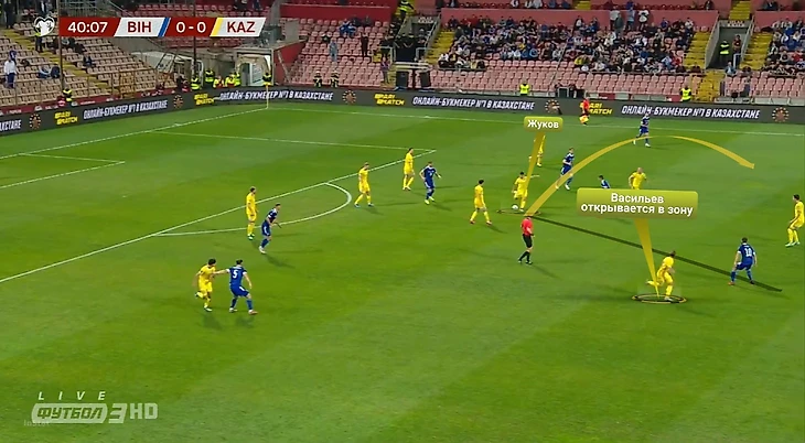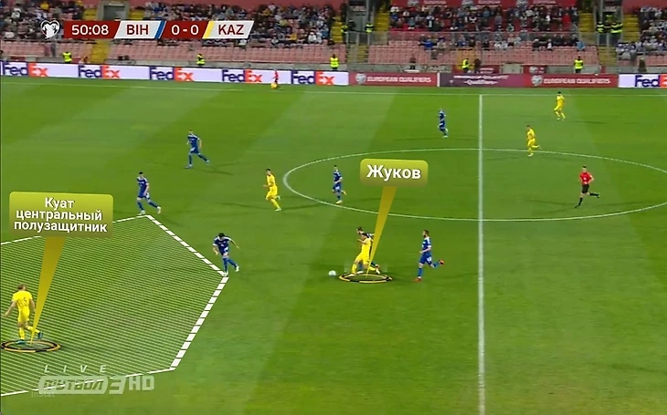 Один из примеров контратаки нашей сборной. Георгий Жуков с помощью дриблинга уходит от прессинга и делает пас в свободную зону, куда открывает номинальный центральный полузащитник Исламбек Куат.