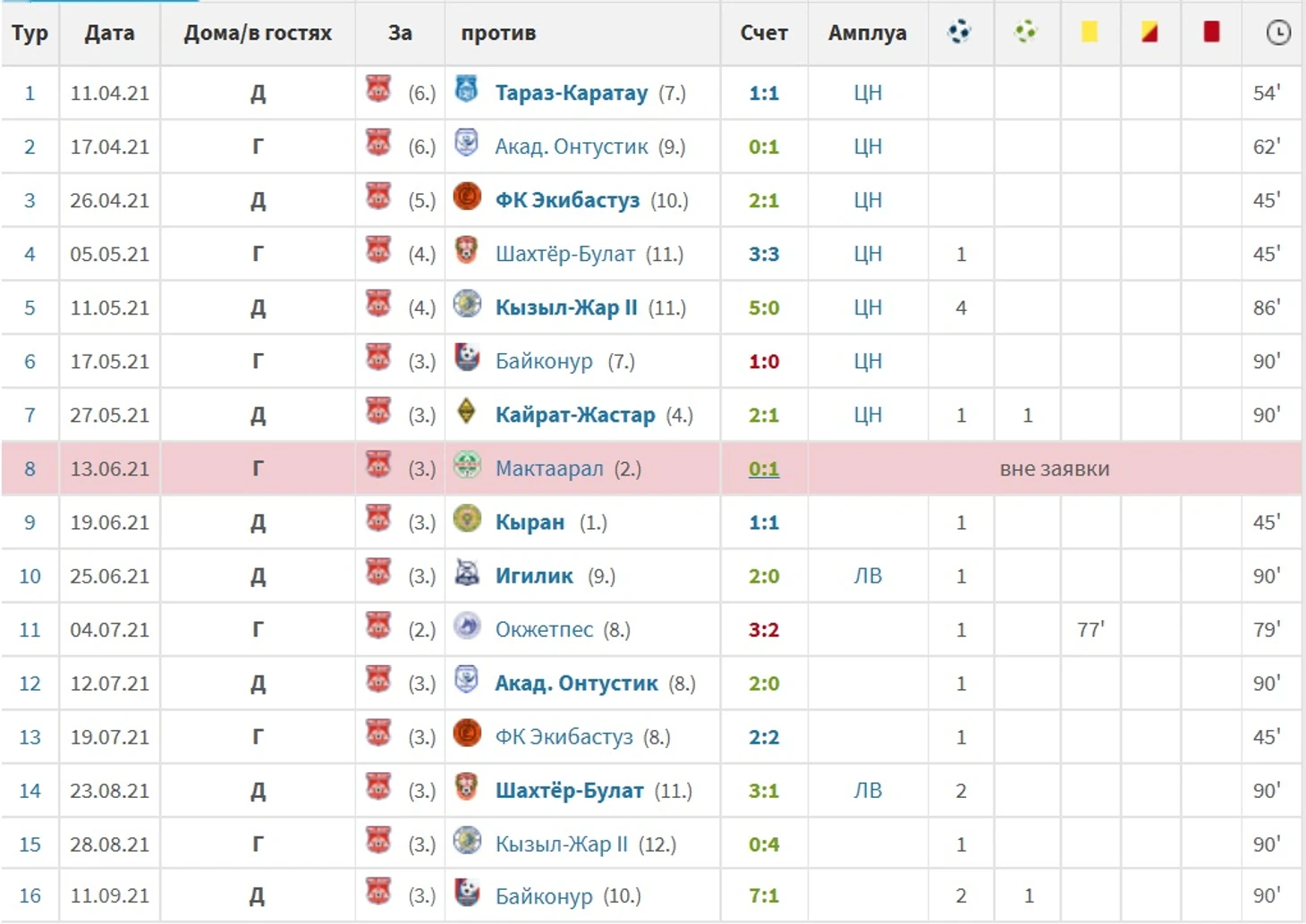 У Мираса Турлыбека – 16 голов в 15 матчах.