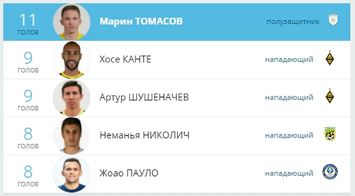 В гонке бомбардиров лидирует Марин Томасов, забивший в чемпионате 11 мячей. По девять голов у кайратовцев Шушеначева и Канте. Их одноклубник Жоао Пауло забил восемь голов, как и бывший форвард «Тобола» Неманья Николич, который уже покинул нашу страну.