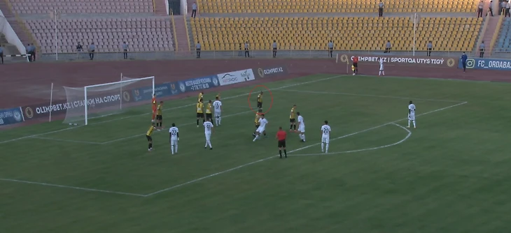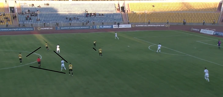 Матч, несмотря на сложную эпидемиологическую обстановку, был проведен со зрителями, но с соблюдением двух условий «военного» времени – заполняемость стадиона не более 20% и пропуск только граждан с «зеленым» статусом, т. е. вакцинированных. В выходные дни подобные ограничения действуют во многих городах страны. Стартовую расстановку алматинцев можно описать как 5-3-2, с Хосе Канте и с известным всем российским любителям футбола Вагнером Лавом на передовой. На двоих форварды забили 16 голов в чемпионате, а форма бывшего армейца для 37-ми лет очень даже приличная. Бердыев далек от соблюдения заповедей Марсело Бьелсы, «религия», как известно, у него своя – оборонительная. Тем не менее, для построения каноничного «автобуса» нужно достаточно времени и подходящее место. Против «Ордабасы» игра алматинцев строилась без активных латералей, с хаотичными перемещениями форвардов, а роль «реджисты» была отведена 30-летнему Денису Полякову, поигравшему не только в родной Белоруссии, но и на Кипре (АПОЭЛ) и в России («Урал»). Его стиль позднего Андреа Пирло определял вектор развития гостевых атак – длинные вертикальные забросы в надежде на скоростные забегания партнеров. Этот «Кайрат» сильно напоминал поздний бердыевский «Рубин», который едва ли не активнее всех в лиге практиковал длинные пасы и находился в постоянном поиске подходящего разыгрывающего из глубины. То Оздоев косячил, то Мвила слишком увлекался и тормозил движение. В «Кайрате» с кадрами не лучше.