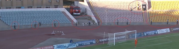 На матчах первенства полицейских примерно в 10 раз больше чем зрителей (причем стоят они группой даже напротив абсолютно пустых трибун – видимо для красоты) и прошедший матч исключением не стал. Для европейского обывателя такие «стюарды» выглядят диковато.